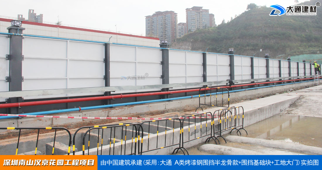 建設工程施工工地四周應按規定設置連續、密閉的鋼結構施工圍擋,建造多層、高層建筑的還應設置安全防護設施。在市區主要路段和市容景觀道路及市場、機場、碼頭、車站廣場等人流量、車流量比較多的地方設置的施工圍擋的高度不得低于2.5m,在其它路段設置的圍擋的高度不得低于1.8m。而深圳市大通建材A類鋼圍擋烤漆半/無龍骨款的標準高度是2.5米、長度為6.3米一擋,而圍擋高度特殊需求的如3//4//5/6/米等高度的可以進行定制化生產。